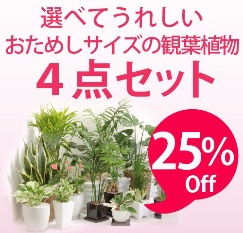 順番に選んでいくと大きさが違う3点の人気観葉植物と鉢カバーが選べます