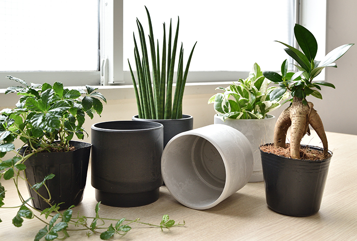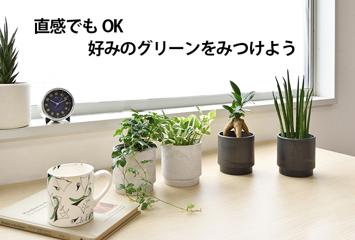 おうち時間を楽しもう。 何かとおうちで過ごす時間が増えた今の生活。 居心地のよい空間づくり、落ち着きのあるくらしづくりに、観葉植物を取り入れてみてはいかがでしょうか。 大きめの植物をお部屋のシンボル的に取り入れるのもいいし、 テーブルサイズの植物をインテリアのアクセントとしてお部屋のあちこちに 置くのもおすすめ。 ここでは、気負わず取り入れられる、小さめの観葉植物をご紹介します。 直感でもOK 好みのグリーンをみつけよう 初心者の方でも気軽に楽しんでもらえうように 育てやすく、気負わずにお部屋に迎えられるものをチョイス。 あわせるポットは2色展開。どちらを選んでも主張しすぎず植物のかわいさを 引き立たせてくれます。