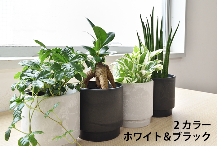 <2カラー・マットポット> ポットは厚みのある樹脂製。 とても軽く、手軽に扱えるのはもちろんのこと、 いかにもプラスチック!というわけではなく、 表面はムラのある仕上げになっていますので、 マットな質感、色合いが様々なインテリアに自然と馴染みます。 <気軽に水やり、気分で入れ替え> 簡単にポットからは取り出せるので、水やり時には取り出して、水の浸透を見ながらのかん水ができますし、 複数鉢を2色で揃えた場合は、ポットと植物の組み合わせをその日の気分に合わせて取り替える、、、 なんてこともできますね。