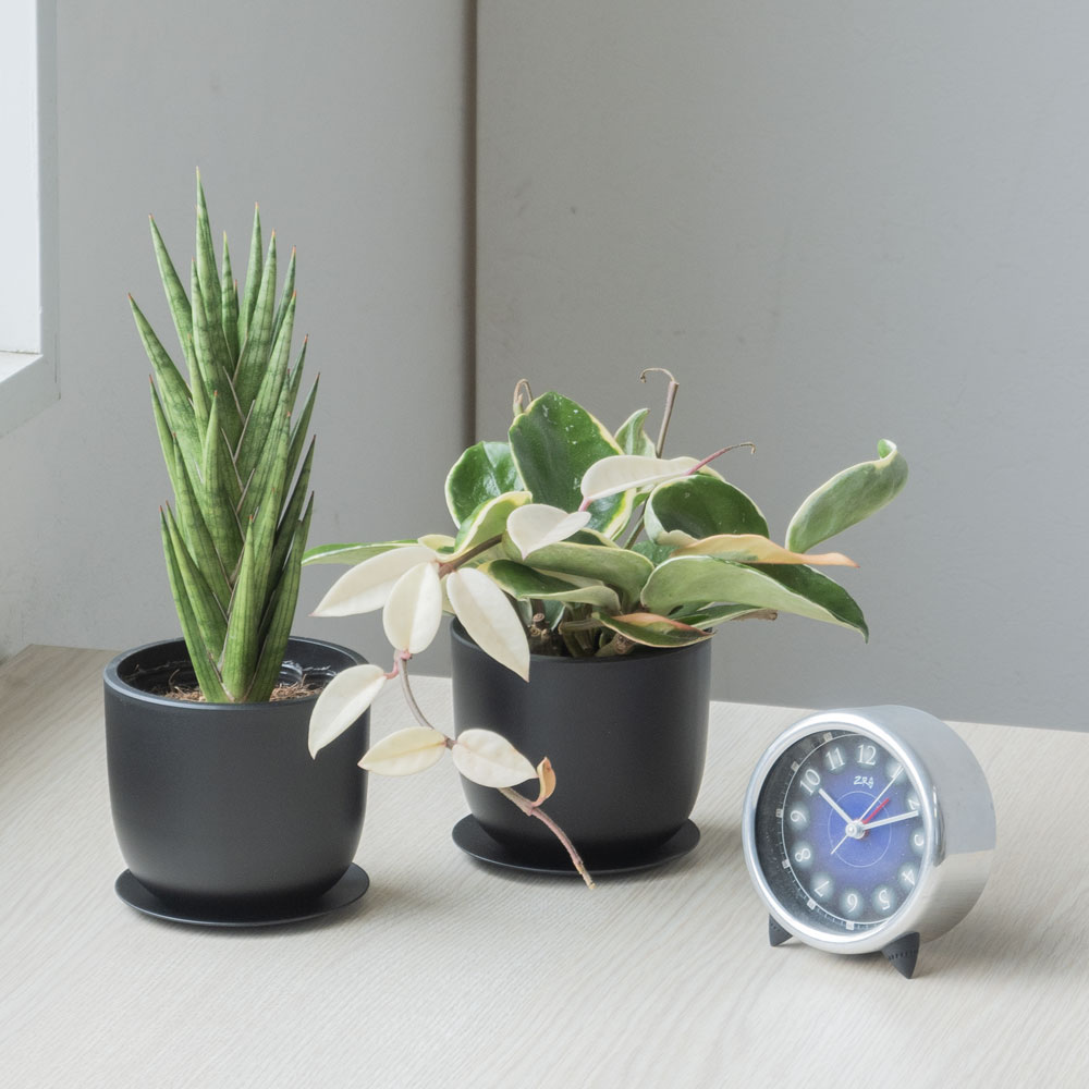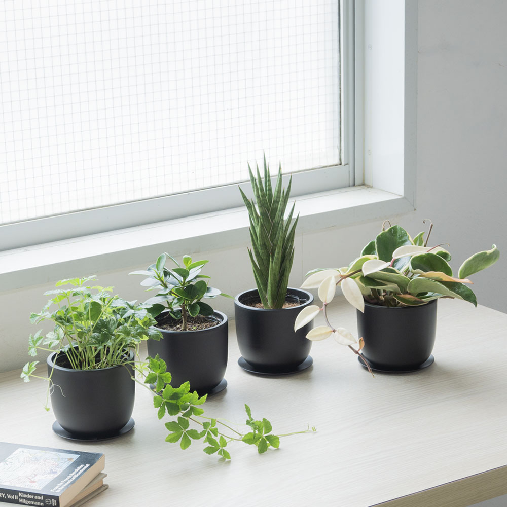 グリーンを生活に取り入れよう。 居心地のよい空間づくり、落ち着きのあるくらしづくりのアイテムに、 観葉植物を取り入れてみてはいかがでしょうか。 大きめの植物をお部屋のシンボル的に取り入れるのもいいし、 テーブルサイズの植物をインテリアのアクセントとして お部屋のあちこちに置くのもおすすめ。 ここでは、気負わず取り入れられる小さめの観葉植物をご紹介します。 環境に配慮したリサイクル素材のポット。 資源の有効活用という観点から、 廃プラスチックを再原料化して作られたリサイクルポットを使用。 マットな黒基調で、グリーンの魅力を美しく引き立てます。 植物は初心者の方でも気軽に楽しんでもらえるように 育てやすく、気負わずにお部屋に迎えられるものをチョイスしました。