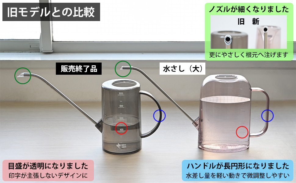 さらに、目盛りが100ml単位でついているので、液肥(液体肥料)の希釈などに使えてとっても便利。 半透明なので、意外と面倒な希釈率も一目で量が確認できる点も要チェック。 デザイン重視のように見えて、実は水やりの基本をしっかり押さえている優等生なんです。