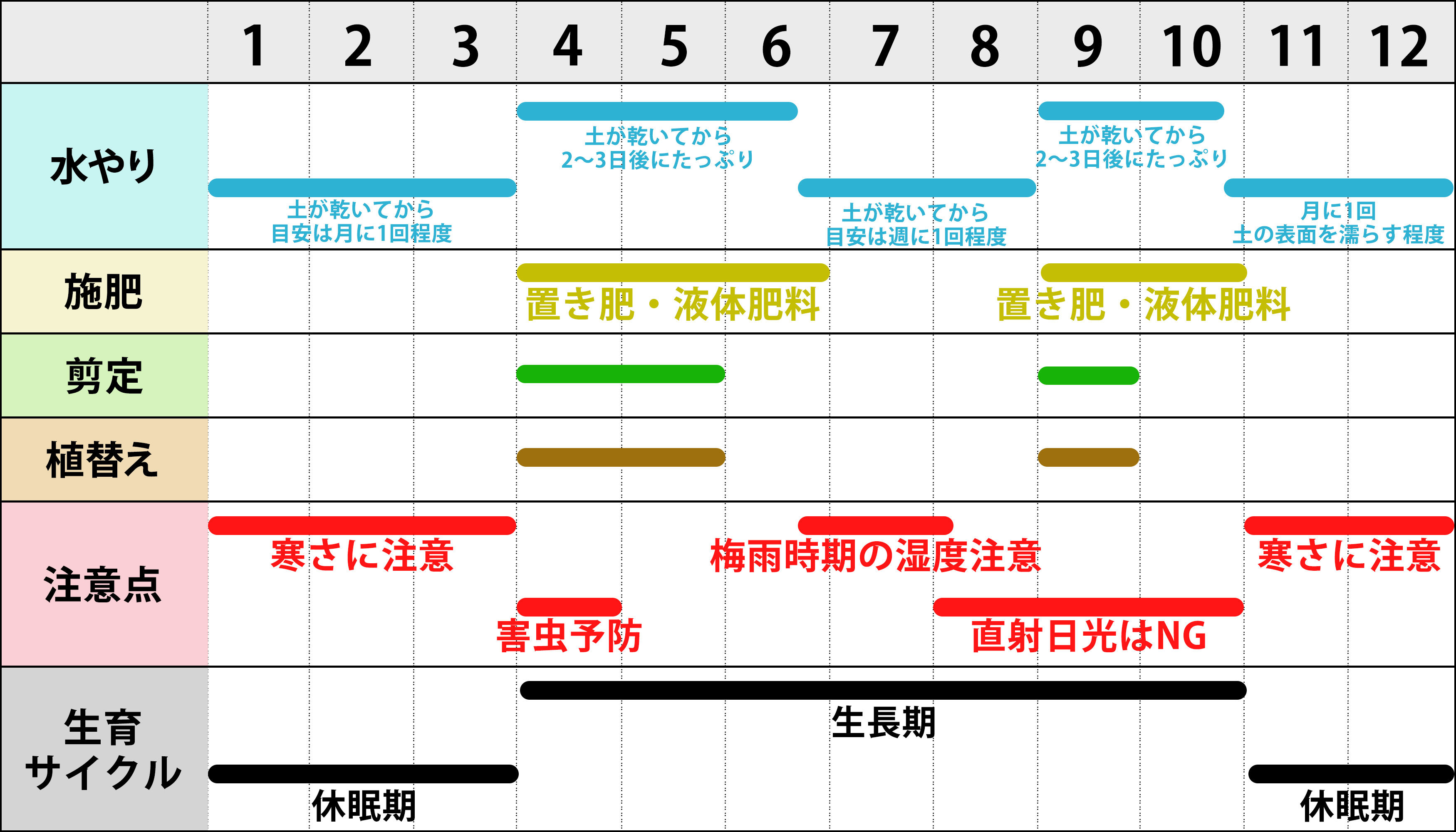 4月~5月・9月が適期です。根が休んでいる時期の植替え作業は、控えたほうが安全です。