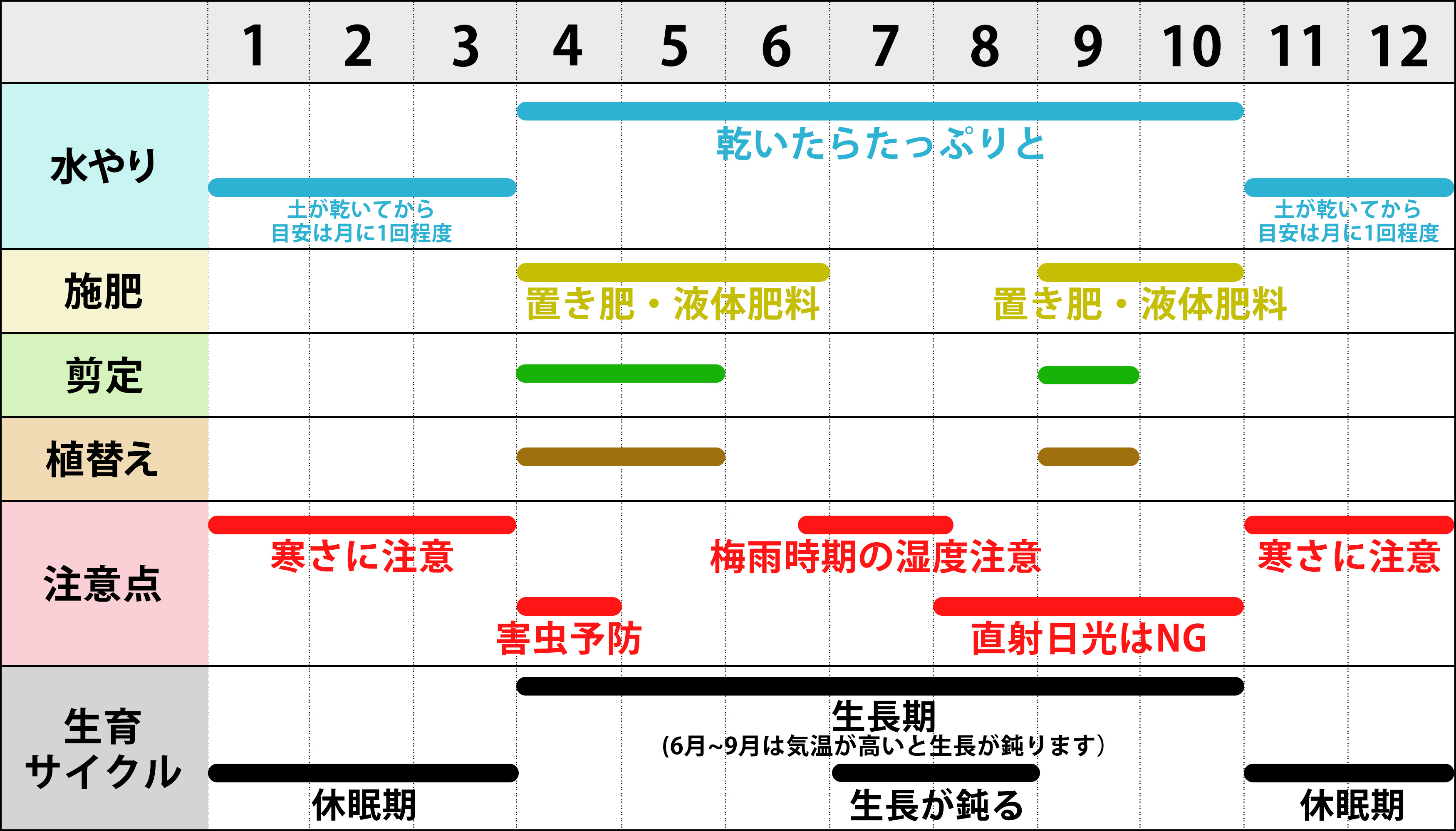 ※7月~8月の気温が高すぎる時期は根が休む場合があります。根が動かない時期に肥料を与えすぎると、肥料焼けを起こします。