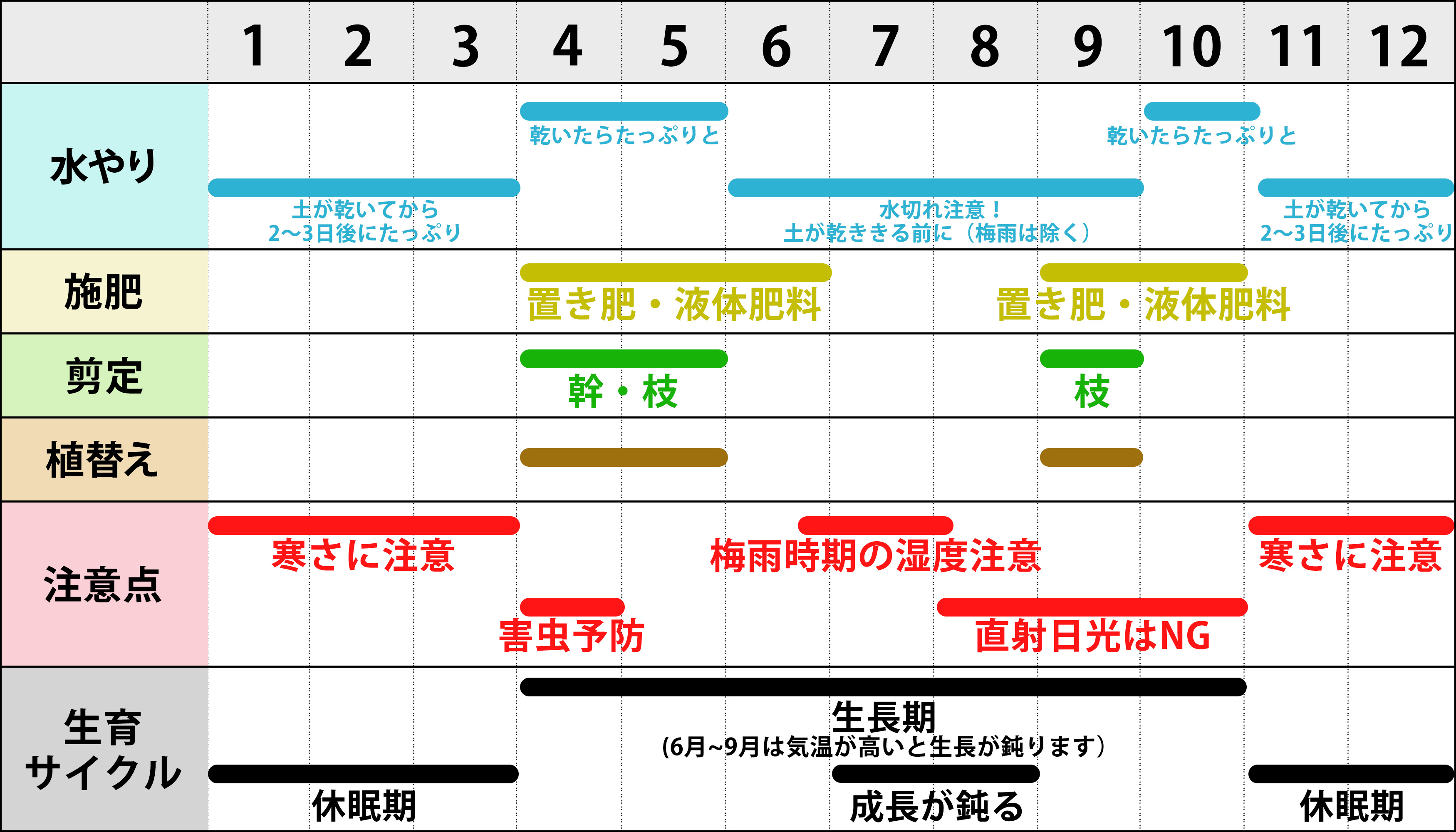 剪定は4月~5月・9月が適期です。休眠期や気温の高い時期に幹を切るなどの大きな剪定作業を行うと枯れるリスクが高まりますのでお控えください。小さな枝や葉を切る程度であれば年間を通していつ行っても良いです。