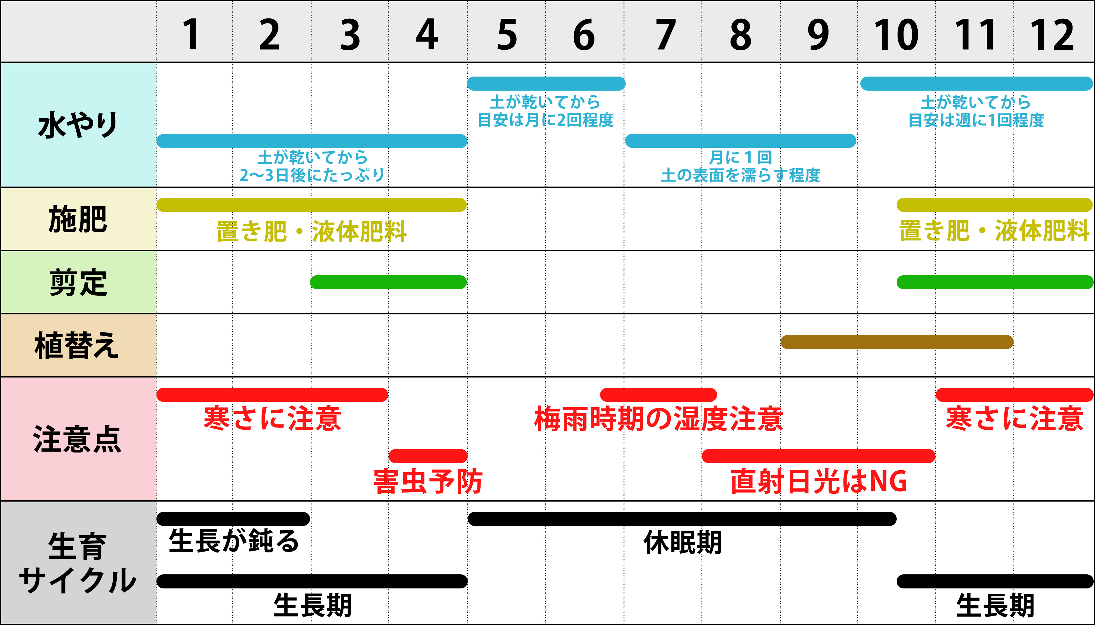 ※7月~8月の気温が高すぎる時期は根が休む場合があります。根が動かない時期に肥料を与えすぎると、肥料焼けを起こします。