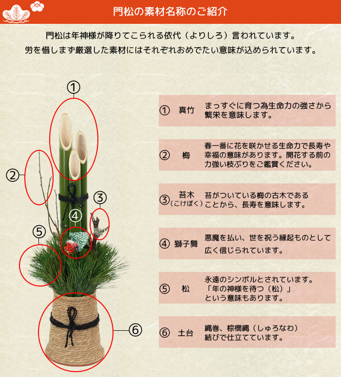 <竹について> すべての門松の竹は、人工のものではなく天然のものを使用しています。 着色加工も行っていませんので、表面に白い粉のような物が付着していることや、傷がついている場合もございます。