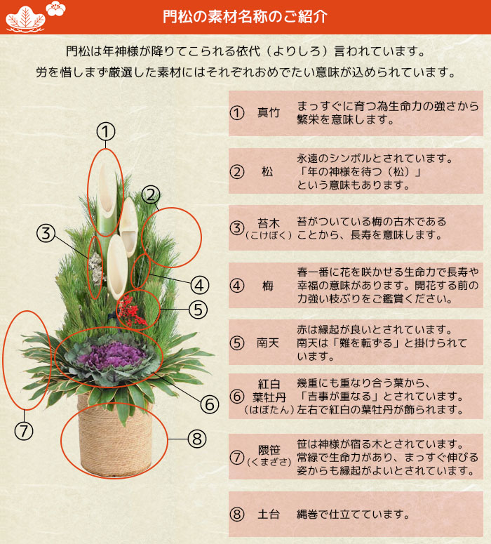 <竹について> すべての門松の竹は、人工のものではなく天然のものを使用しています。 着色加工も行っていませんので、表面に白い粉のような物が付着していることや、傷がついている場合もございます。