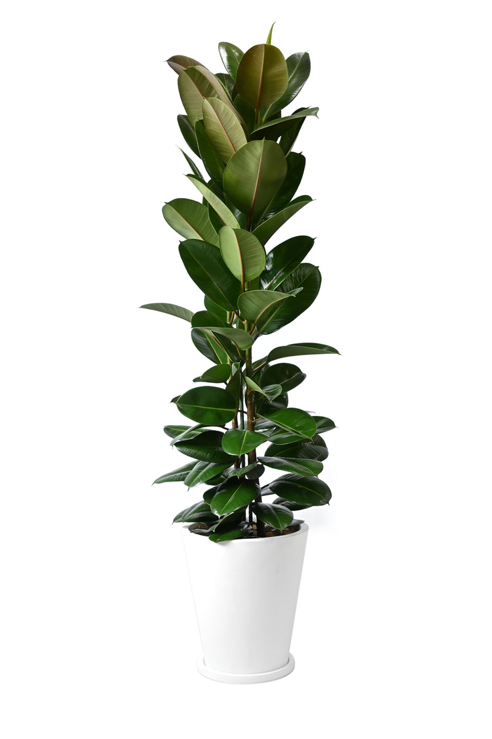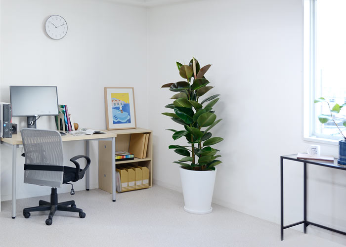 葉が丸く節間が短い皆さんよくご存知、代表的なゴムノキです。 大きく肉厚で艶やかな葉が何枚も重なり合っている姿は立派でとても見ごたえがあります。 新芽のうちは、葉色が褐色なのも特徴で、時間をかけて濃いグリーンになっていきます。 変化していく葉色は日々の生長を感じさせ見ていて飽きません。