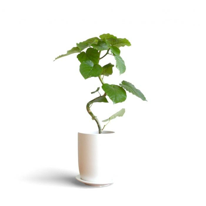 清潔感あふれるホワイトの陶器鉢にセットされた、美しい「曲がり」のウンベラータ。