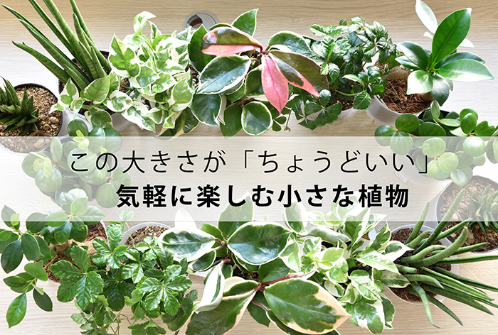 選ぶ楽しみ、飾る楽しみ。 小さいサイズの観葉植物は、テーブルやデスクの上、 キッチンのちょっとしたスペースなどなど、 場所を選ばず、お部屋のアクセントとして、その空間にいろどりを与えてくれます。 そんな飾る楽しさを初心者の方でも気軽に味わっていただけるよう、 ここで紹介する植物たちは、どれも育てやすく 気負わずにお部屋に迎えられるものをチョイスしました。 じっくり選んだ1鉢を、まずは気軽に楽しむもよし。 一度にいくつも揃えて賑やかに楽しむもよし。 お部屋との相性もイメージしながら選んでみてくださいね。