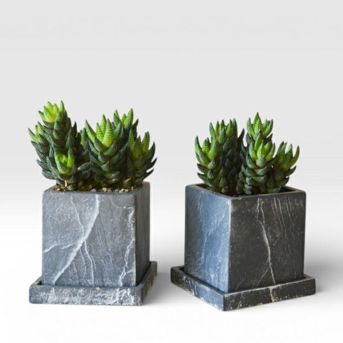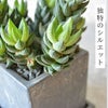 上へ上へと積み重なるように成長する葉が、まるで五重塔のような硬質な美しさを放ちます。 成長が緩やかなため、場所を取らずに長くその姿を楽しめます。オフィスのデスクや、窓辺のアクセントに最適です。 陶器製のポットはスタイリッシュなストーン調スクエアポット。 小さなサイズでも安っぽさがないしっかりとしたポットです。 飽きのこないかわいいテーブルサイズは、ちょっとしたギフトにも使えますね。