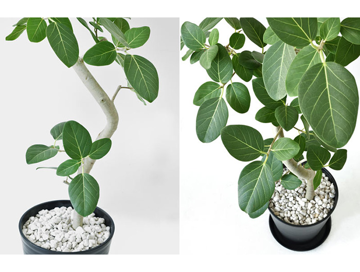 文字通りインド・ベンガル地方が故郷のベンガルボイジュ。 自生地では、幹から出てくる旺盛な気根が地面に達してどんどん横に広がり、 400mを超える森を辿っていくと1本のベンガルボダイジュだった・・・なんて例もあるとか。 同じゴムの木の仲間、ウンベラータやアルテシーマと並び人気のあるグリーンで、 白い幹ときれいな葉脈が特徴的な、まあるい葉っぱは清潔感があり、お部屋にもよく馴染みます。