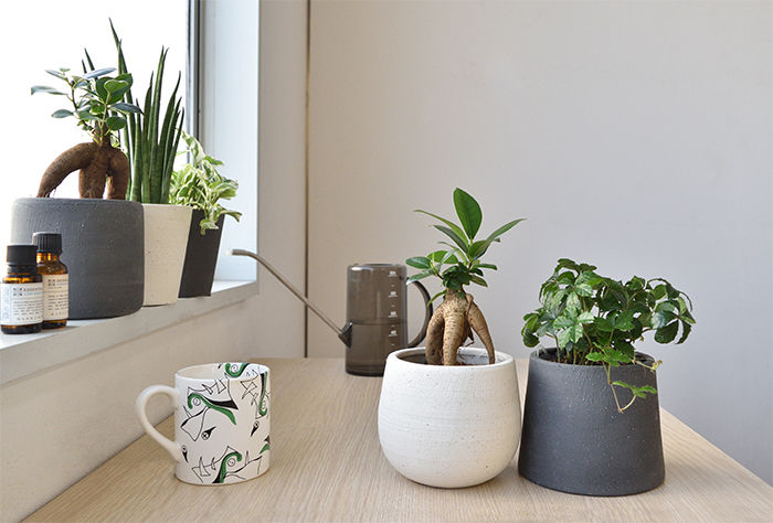ホワイトとグレーの2色展開の陶器ポット。 ポットの形は4パターン。 どれもシンプルで主張しすぎない落ち着いたデザインなので、異なる色・デザインで複数個ならべても 違和感なくお部屋になじみます。 ちょっとした工夫です。 <簡易底面かん水> 植物が植っているインナーポットの鉢底には底面かん水用の不織布テープがついています。 旅行などでしばらく水やりが出来ない場合でも、陶器ポットに少し水を貯めておけば、 不織布の毛管現象により用土の底部分まで水を吸い上げてくれ、水切れを防ぐことができます。 <きちんと水やり、気軽に入れ替え> インナーポットは、陶器ポットにセットした際にハンドルが少し上に出るように設計されているため、 取り出しがしやすいようになっています。 ちょっとしたことですが、 簡単に陶器から取り出せるので、水やり時には取り出して、水の浸透を見ながらのかん水ができますし、 複数のポットを揃えた場合は、ポットと植物の組み合わせをその日の気分に合わせて取り替える、、、 なんてこともできますね。