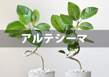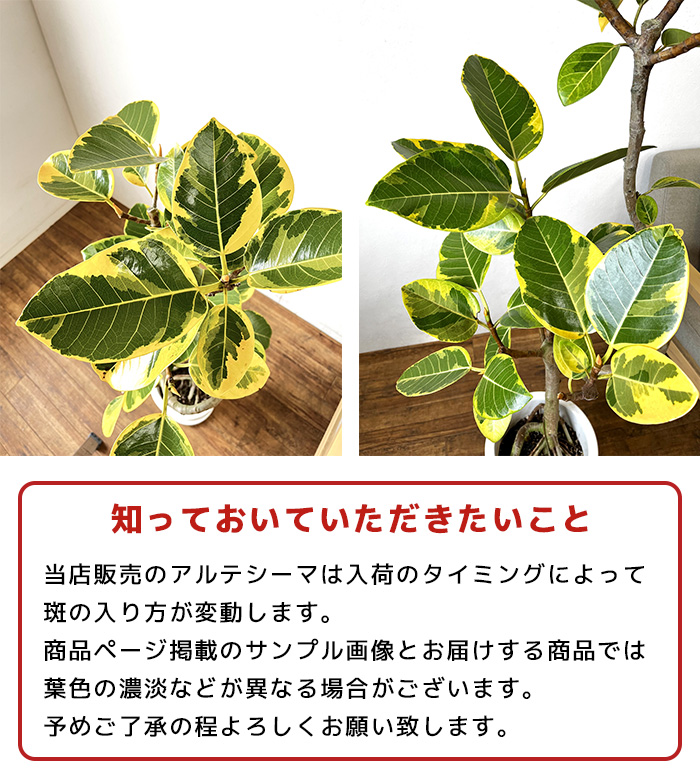 インテリアグリーンの定番 フィカス アルテシーマは、人気の観葉植物 ウンベラータと同じくフィカス属、ゴムの木の仲間です。 ゴムの木の特長でもある「丈夫で育てやすい」ところはウンベラータと同じで、 最近ではインテリアグリーンの定番といってもよいくらいに人気がでている植物です。 「育てやすさ」とあわせて、アルテシーマの人気のひみつは、 なんといっても色鮮やかな明るい印象の葉っぱ。 濃淡のある葉色ときれいな葉脈、そしてところどころに入った明るい黄色の「斑(ふ)」が、 お部屋に「いろどり」と「明るさ」をもたらしてくれるでしょう。 ※入荷のタイミングで斑の入り方(葉色の濃淡)は変動します。