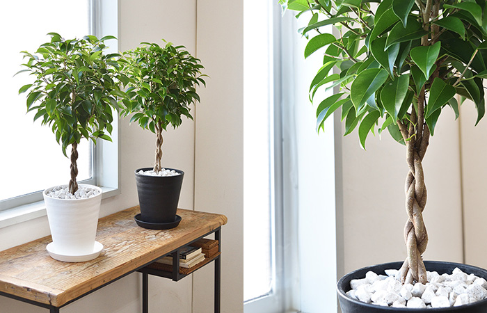 - 緑色で光沢のある鮮やかな葉っぱが魅力です。幹が扱い易いので、いろいろな仕立てができ、バリエーションも豊富で、おもしろい樹(ゴムノキの仲間)です。