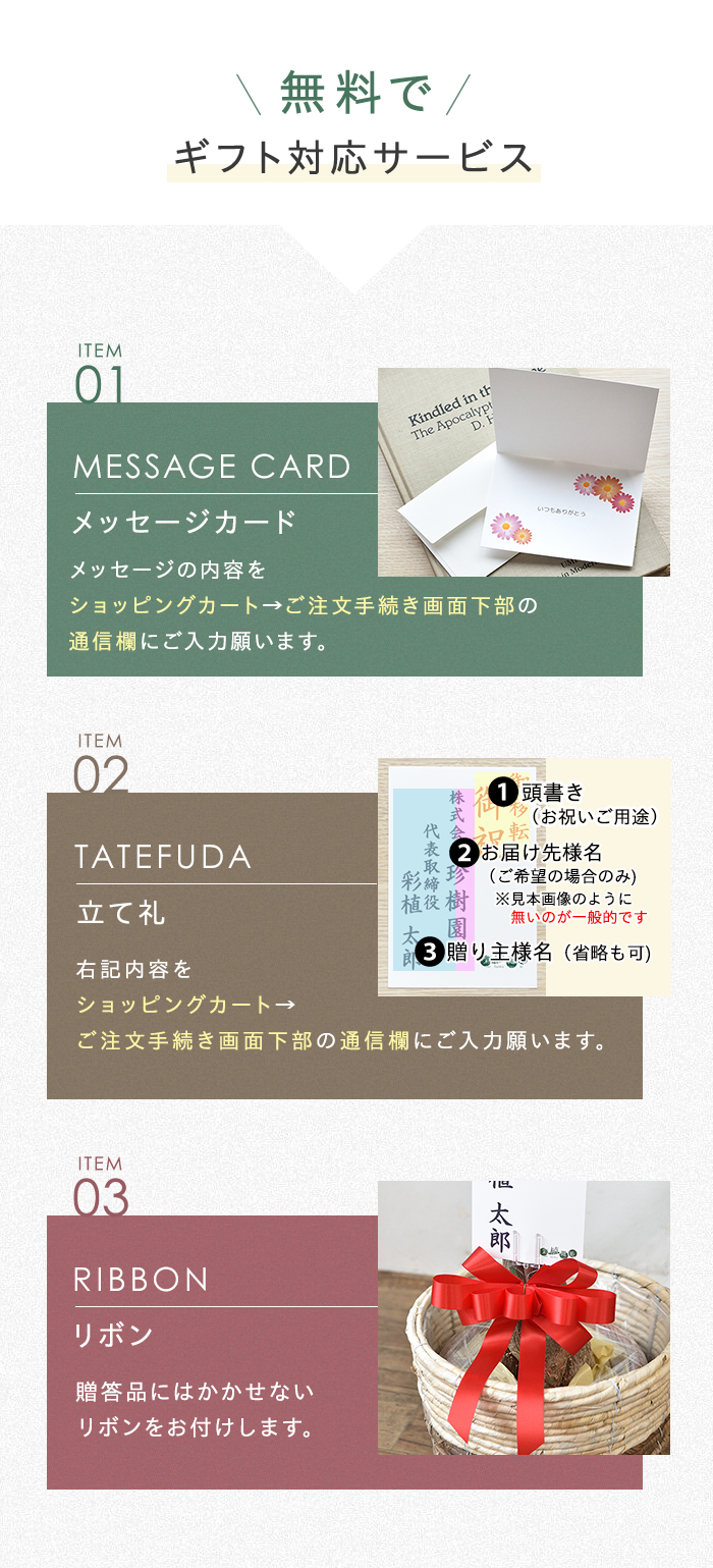 彩植健美ではギフトに欠かせない「お祝い立札」やお祝いの言葉を伝える「メッセージカード」をどの観葉植物にもリボンを添えて無料でお付けいたします。