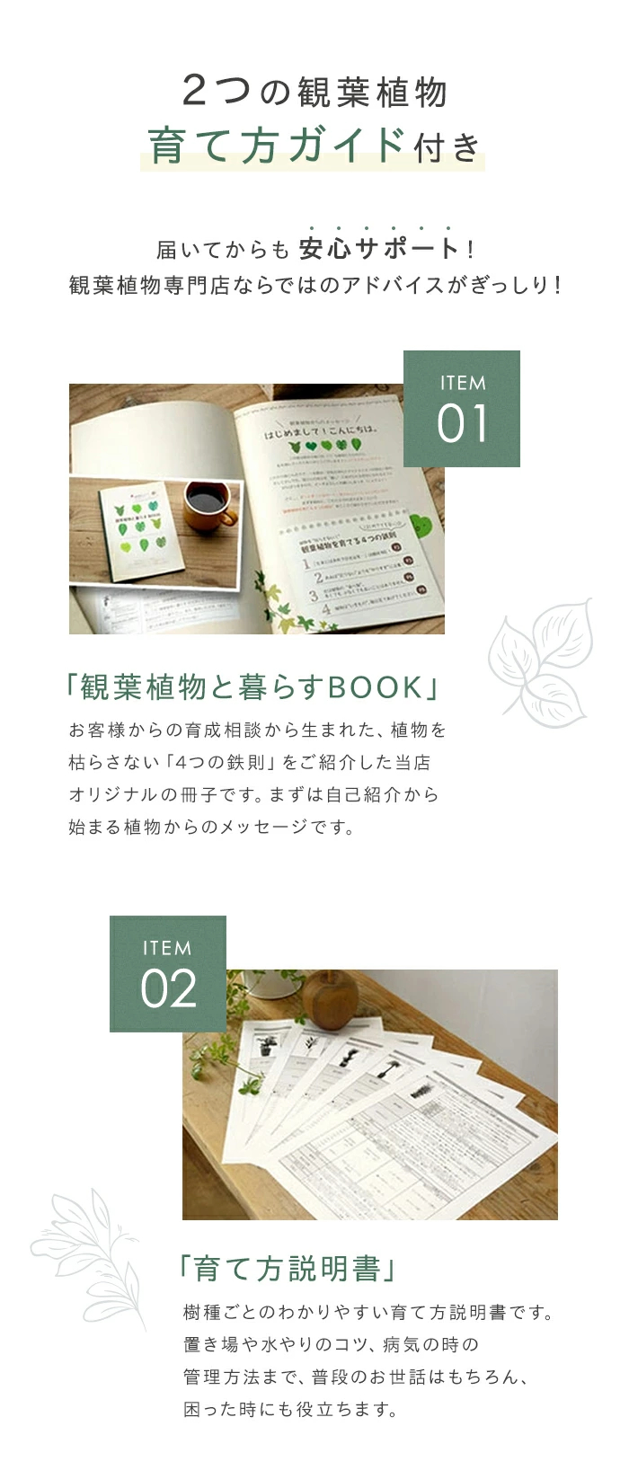 彩植健美がお届けする観葉植物には、当店オリジナルの冊子「観葉植物と暮らすBOOK」と、お送りした植物の特性にあわせた育て方説明書を同封しております(屋外用・一部のアウトレット商品を除く)。