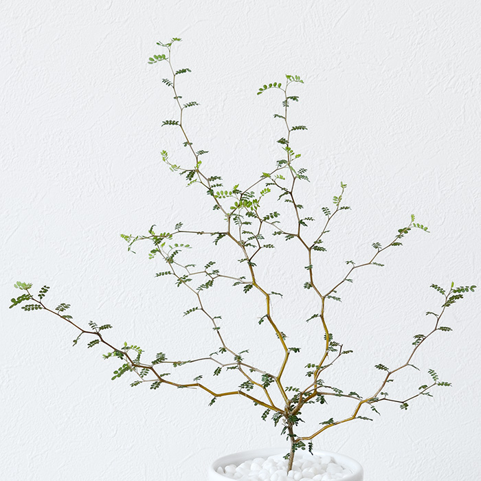 ジグザグに伸びる華奢な枝も点々を連ねたようなミクロな葉っぱもとても個性的。