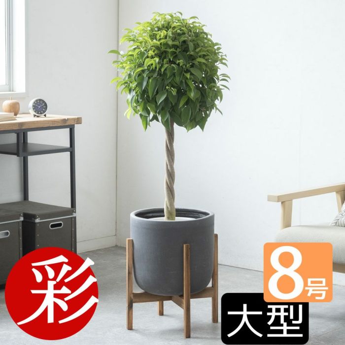 長寿の木とあがめられるシンボルツリー 文字通りインド・ベンガル地方が故郷のベンガルボダイジュ。 地元では長寿の木としてあがめられ、生命力の強さは折り紙付き。 自生地では、幹から出てくる旺盛な気根が地面に達してどんどん横に広がり、 400mを超える森を辿っていくと1本のベンガルボダイジュだった・・・なんて例もあるとか。 家族を見守るシンボルツリーとしてお迎えしてはいかがでしょうか。 シルエットは個性的 ゆるやかな曲線をえがいたそのシルエット(=樹形) ゴムの木ならではの柔軟性のある幹を、生産の段階で馴らしていくことで 人工的(=不自然)になりすぎない絶妙なバランスのシルエットに仕立てられています。 曲がり具合は、それぞれ。 仕立てられたものではありますが、個体によりちょっとずつ違います。 今後の生長でもシルエットは変わっていくもの。その日々の変化も楽しみのひとつになりますね。 ポットについて 植物自体はプラスチック素材のいわゆる一般的な「プラ鉢(白・または茶・紺)」に植わっています。 もちろん管理する上では、そのままでも大丈夫なのですが、 インテリアとして考えると、見た目的に少し味気ない。。 そういう場合は、鉢カバーも一緒に揃えていただくのがおすすめの飾り方。 ここでは陶器製の鉢カバーポットとセットでのご紹介。 上品な印象のホワイトとグレーの陶器がグリーンを引き立てます。 主張しすぎないモダンなデザインは、どんなインテリアにもマッチします。 (※土の部分を覆うヤシ素材のマルチング材も付属します。) オプションのポットスタンドを利用すると、より一層インテリア感アップ。 スタンドを用いて少し高さをつけると、抜け感が生まれ、印象がガラリと変わります。 アカシア材を使用したウッドポットスタンドは、四本の脚でしっかりと支え、安定感は◎。 組み立ても、ビスで一か所止めるだけの簡単仕様です。