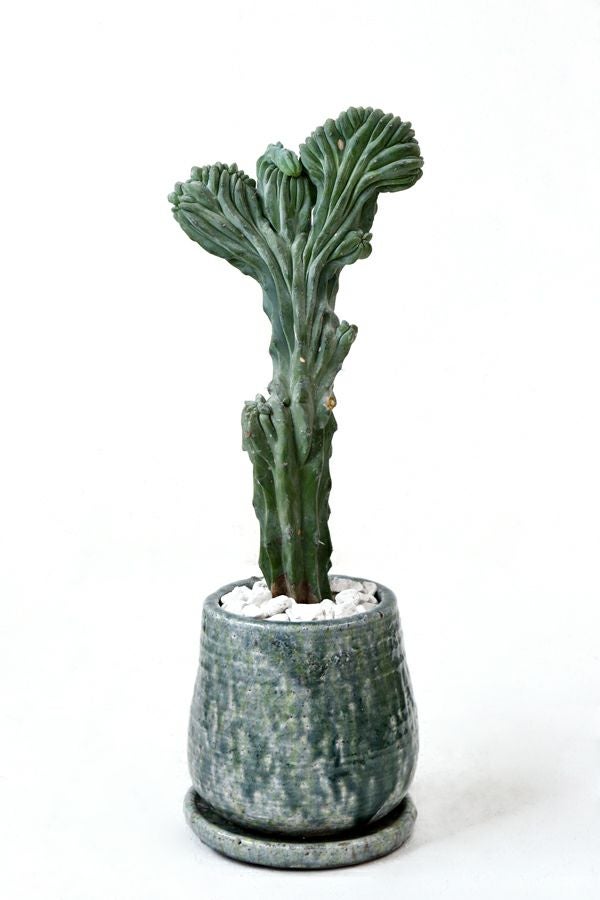 人気のサボテン、柱サボテン:ミルチロカクタス 竜神木(リュウジンボク)。 サボテンといってみなさん真っ先に思い浮かべるのは「柱サボテン」ではないでしょうか? 荒涼とした砂漠地帯に自生している姿や、はたまたショップインテリアの一つとして カフェや雑貨屋さんなどに置かれているのを一度は見かけたことがあるはずです。 ひと口に柱サボテンと言ってもたくさんの種類があるのですが、 今回ご紹介するのは、数ある柱サボテンの中でも人気のある「竜神木(りゅうじんぼく)」。 人気のヒミツは、、 竜神木特有の短い棘と美しい肌が、このサボテンの人気のヒミツ。 サボテンの魅力といえば、なんといっても「棘(トゲ)!」、、という方には 物足りないほどの短いトゲなので、そんなに危なくないです。 またその肌は粉を吹いたような青緑色で、名前の通り竜のよう。(、、かどうかは正直微妙ですが) 光の当たり方によっては、ターコイズブルーのようにもみえる肌の美しさはとても神秘的。 最大の特徴は、、綴化。 綴化、、「てっか」と読みます。 綴化は、サボテンに限らず他の植物にもみられる現象で、生長点などに突然変異が起こり、 通常とは違う形状になる、、いわゆる「奇形」のこと。 この現象は、花や果実にも起き、農作物では商品価値を下げるものとして敬遠されることが多いのですが、、 園芸の世界ではその真逆。もともとひとつとして同じ形のない姿が、さらに独特な姿になっているので 珍しい、希少だということで重宝されるのです。 ご紹介する竜神木の綴化は、頭の部分の独特な形状。 頭でっかちに、まさに突然変異しています。 サボテンにはこのような綴化種の品種は数多く存在するのですが、 竜神木の綴化は 噂では段々と生産数が減ってきていて、じわりじわりとその希少性があがっている、、とも言われています。 じっとみてると、じりじりと増殖していきそうな、 見事な造形美のアート的なシルエットは、このまま美術館にでも展示されてそうな存在感。 モダンインテリアとしてみても、かなりのインパクトです。 少し価格は高めですが、他にはないものをお探しでしたら、迷いなくお選びください。 おススメです! 現品をお届け。 今回は数量限定、1点のみの入荷。 お写真そのものをお届けいたします。 【ポットについて】 自然な風合いを出す為あえて荒っぽく仕上げたアンティーク仕立て。ラフな質感が植物を引き立たせてくれます。 ※アンティーク仕立ての為、鉢の擦れ跡、釉薬の剥がれなどが見られる場合があります。  あえてラフな仕上がりを演出したものですので予めご了承ください。 受け皿は防水加工を施しておりますが完全防水ではございません。 長時間水を溜めておくと漏れ出す可能性がございます。 溜まった水はお早めに捨てて頂く事をおすすめ致します。