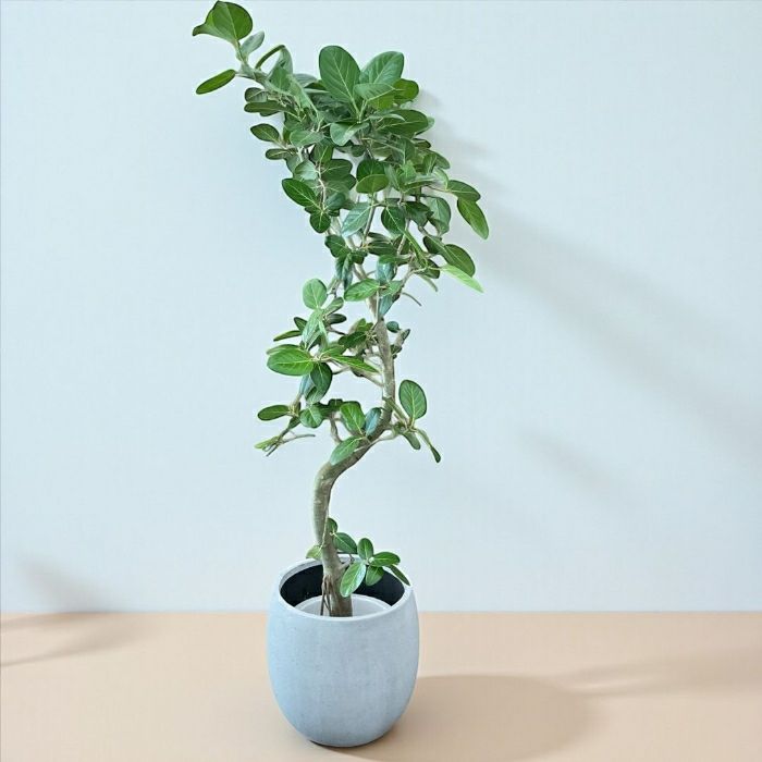 長寿の木とあがめられるシンボルツリー 文字通りインド・ベンガル地方が故郷のベンガルボダイジュ。 地元では長寿の木としてあがめられ、生命力の強さは折り紙付き。 自生地では、幹から出てくる旺盛な気根が地面に達してどんどん横に広がり、 400mを超える森を辿っていくと1本のベンガルボダイジュだった・・・なんて例もあるとか。 家族を見守るシンボルツリーとしてお迎えしてはいかがでしょうか。 シルエットは個性的 ゆるやかな曲線をえがいたそのシルエット(=樹形) ゴムの木ならではの柔軟性のある幹を、生産の段階で馴らしていくことで 人工的(=不自然)になりすぎない絶妙なバランスのシルエットに仕立てられています。 曲がり具合は、それぞれ。 仕立てられたものではありますが、個体によりちょっとずつ違います。 今後の生長でもシルエットは変わっていくもの。その日々の変化も楽しみのひとつになりますね。 ポットについて 植物自体はプラスチック素材のいわゆる一般的な「プラ鉢(白・または茶・紺)」に植わっています。 もちろん管理する上では、そのままでも大丈夫なのですが、 インテリアとして考えると、見た目的に少し味気ない。。 そういう場合は、鉢カバーも一緒に揃えていただくのがおすすめの飾り方。 ここでは陶器製の鉢カバーポットとセットでのご紹介。 上品な印象のホワイトとグレーの陶器がグリーンを引き立てます。 主張しすぎないモダンなデザインは、どんなインテリアにもマッチします。 (※土の部分を覆うヤシ素材のマルチング材も付属します。) オプションのポットスタンドを利用すると、より一層インテリア感アップ。 スタンドを用いて少し高さをつけると、抜け感が生まれ、印象がガラリと変わります。 アカシア材を使用したウッドポットスタンドは、四本の脚でしっかりと支え、安定感は◎。 組み立ても、ビスで一か所止めるだけの簡単仕様です。