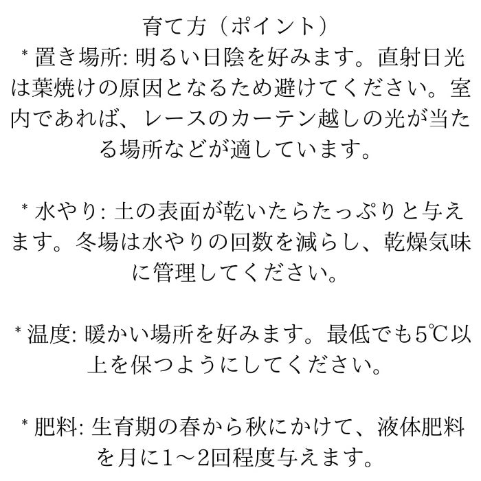 コンパクトサイズのシェフレラ 日本で古くから親しまれてきた観葉植物"ホンコンカポック"に似た品種で、 小さく可愛らしいサイズのシェフレラ・コンパクタ とにかく丈夫で育てやすく、 生育旺盛であまり日の当たらない窓際でもOK 置かれた環境に適応する優秀な植物です。 葉も小ぶりであまり大きくならない品種ですが、 小さい割には、葉をたくさん茂らせますので 成長をしっかり感じさせてくれます。 親しまれる理由は 耐暑性・耐寒性・耐陰性に優れており管理がしやすいので、初心者の方でも大丈夫。 丈夫で枯れにくいから、ずっと身近な存在として街中にもあふれてます。 テーブルや棚にも置けるサイズ感なので、 お手軽インテリアグリーンとしてコーディネートしやすい点もポイント。 植物を育てたことがない初心者さん、まずはこの1鉢からはじめてみてはいかがでしょうか。 ポットはシンプルなキューブ型 表面は無骨なストーン調の仕上げ。シンプルな器をあわせて グリーンの魅力をより引き立たせました。